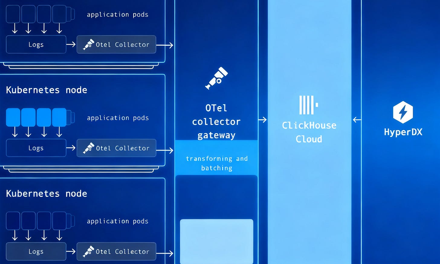 They deployed OpenTelemetry Collectors on each node to batch and asynchronously write logs into ClickHouse.
